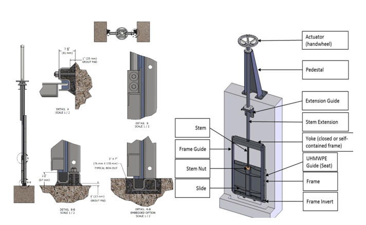 Van cửa phai được sử dụng trong kênh dẫn và bể xử lý nước thải, cho phép đóng/mở dòng chảy linh hoạt, vận hành thủ công hoặc tự động.